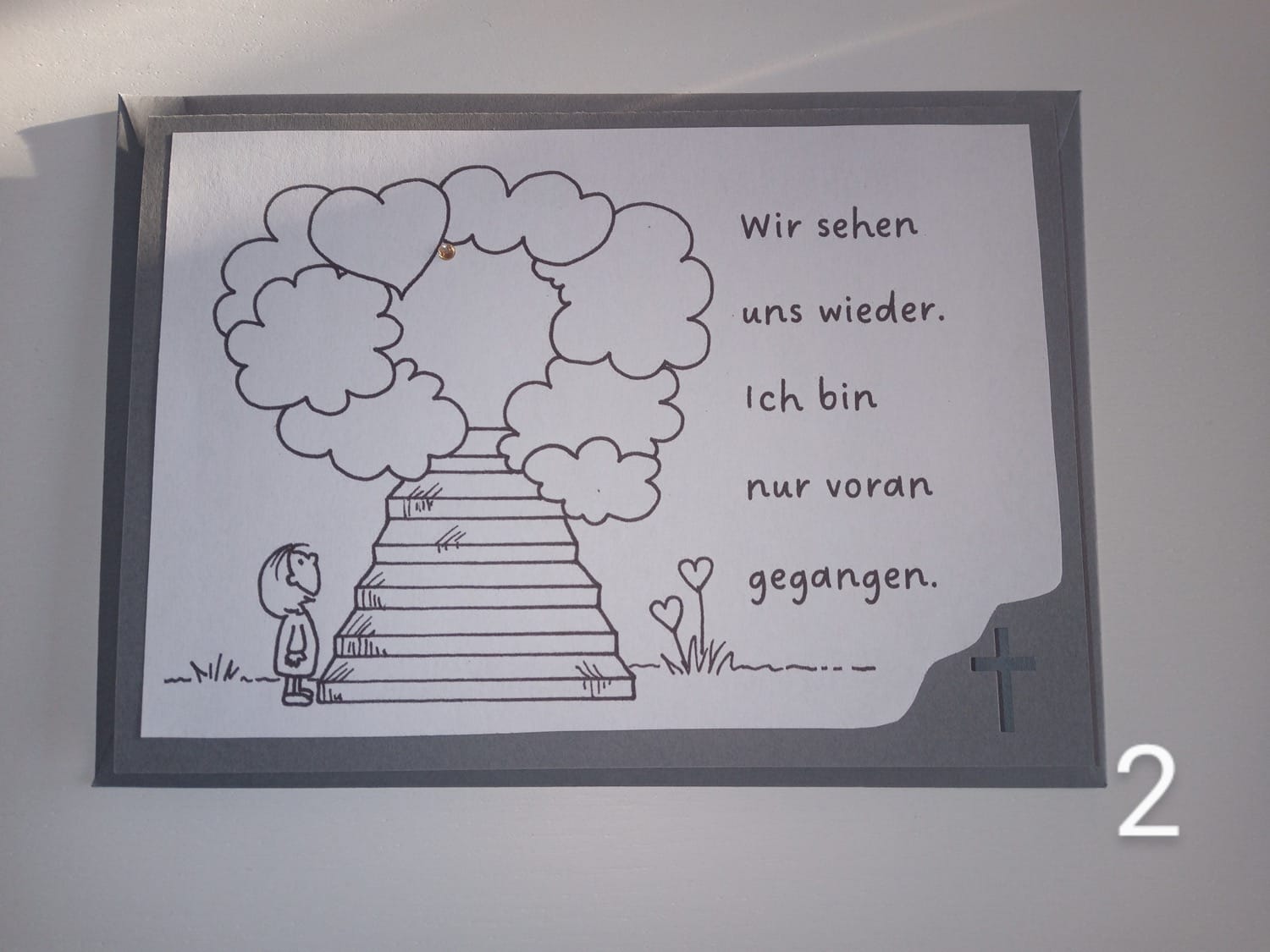 Hallo liebe Kundinnen und Kunden, wir haben etwas Neues im Sortiment. Selbstgestaltete Trostkarten. Der Text und die Zeichnung kommen von uns und alle Karten sind handgemacht. Es sind Klappkarten im Querformat in einem edlen grau, die man sich auch gerne so auf den Schrank oder die Fensterbank stellt. Abgerundet werden die Karten mit einem Stein, der glänzt. Dieser Stein soll die Verbundenheit mit dem Verstorbenen darstellen, da unsere Karten so geschrieben sind, dass der Verstorbene den Hinterbliebenen Trost spendet. Denn .... man stirbt nie ganz.